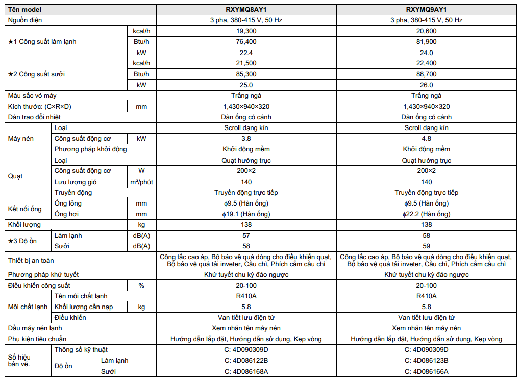 Thống số kỹ thuật dàn nóng trung tâm Daikin VRV IV S 2 chiều RXYMQ8AY1